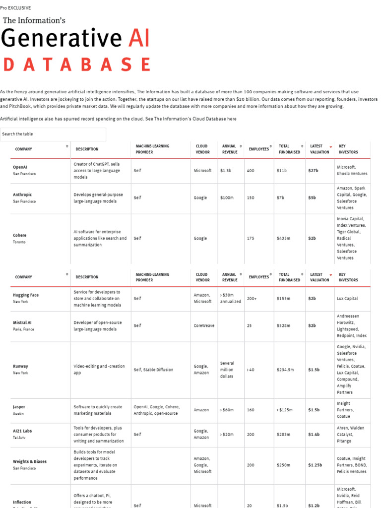 As the frenzy around generative artificial intelligence intensifies, The Information has built a database of more than 100 companies making software and services that use