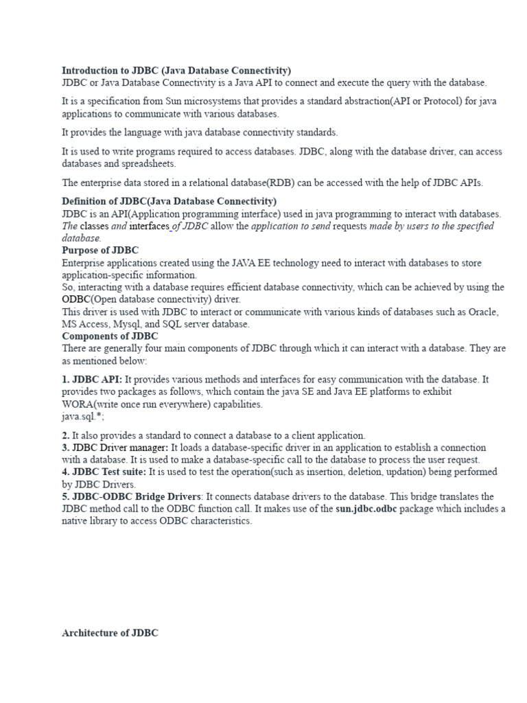 1. JDBC API: It provides various methods and interfaces for easy communication with the database. It