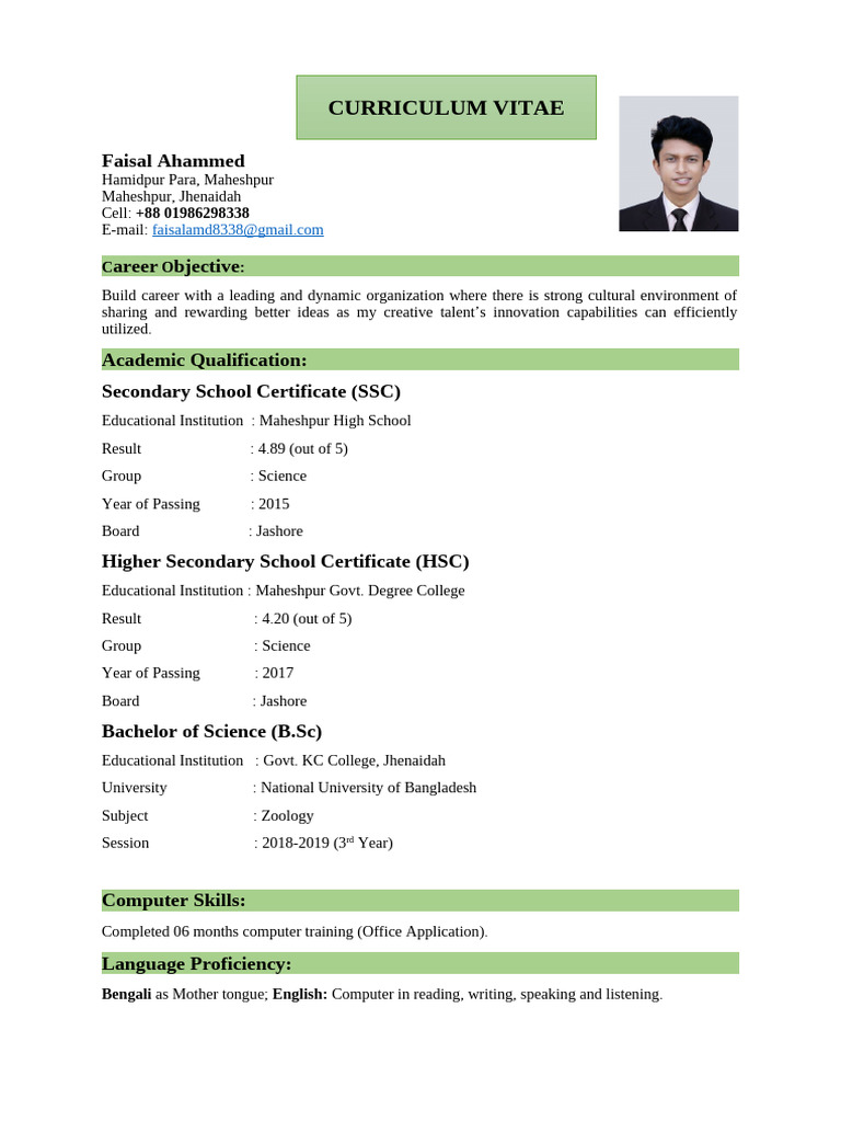 Bengali as Mother tongue; English: Computer in reading, writing, speaking and listening.