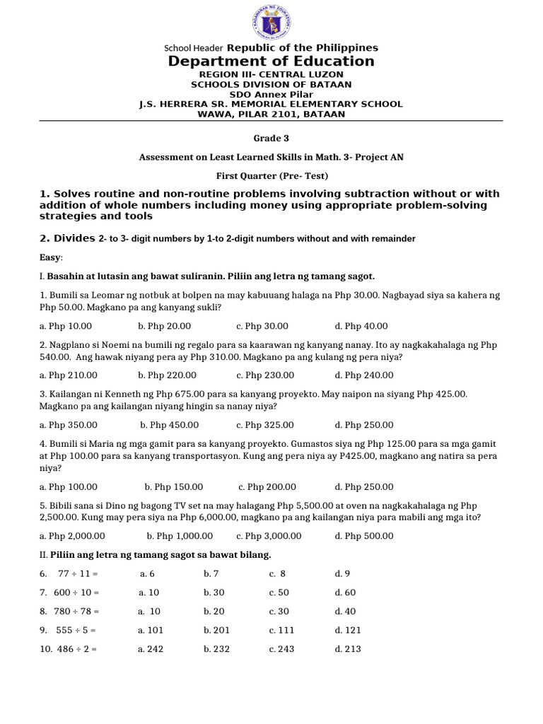 Assessment on Least Learned Skills in Math. 3- Project AN