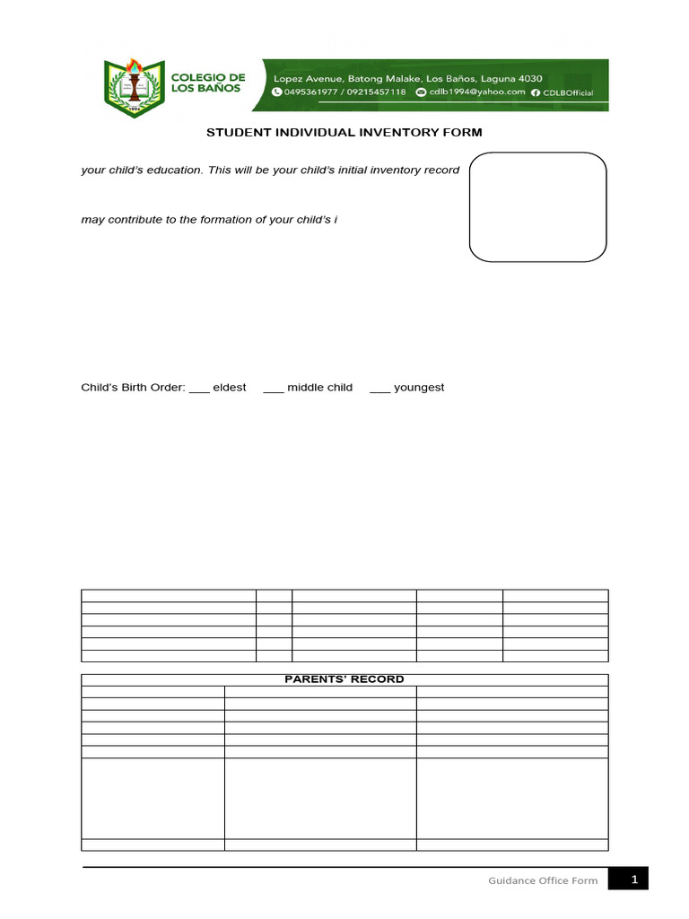 STUDENT INDIVIDUAL INVENTORY FORM