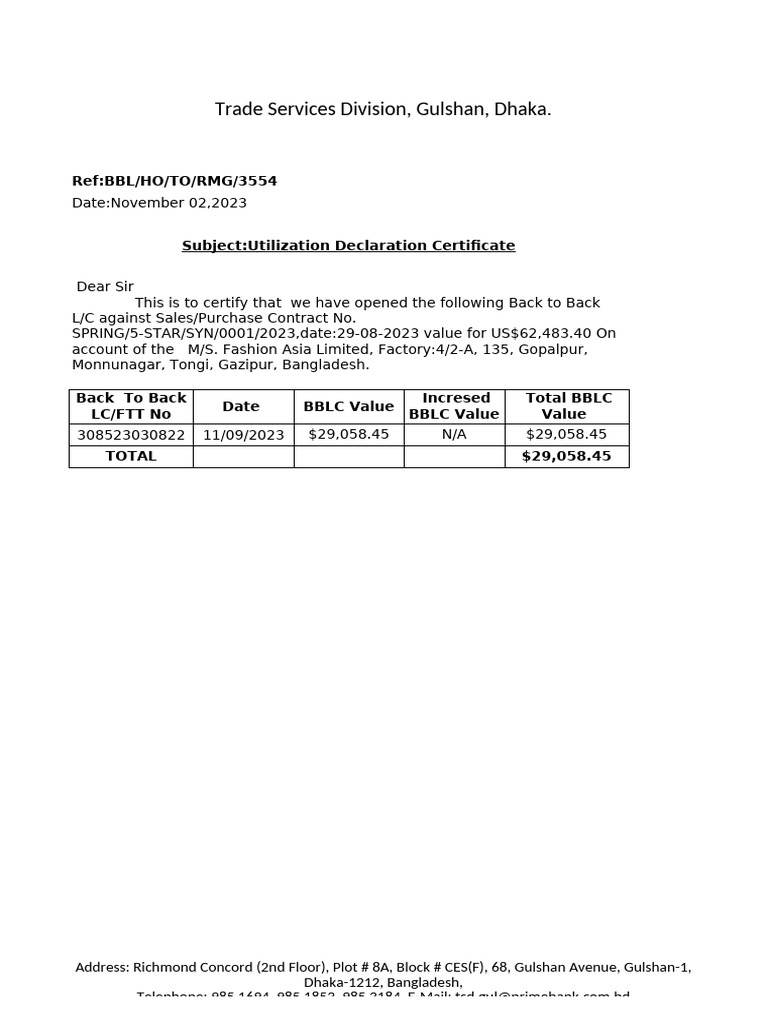 account of the M/S. Fashion Asia Limited, Factory:4/2-A, 135, Gopalpur,