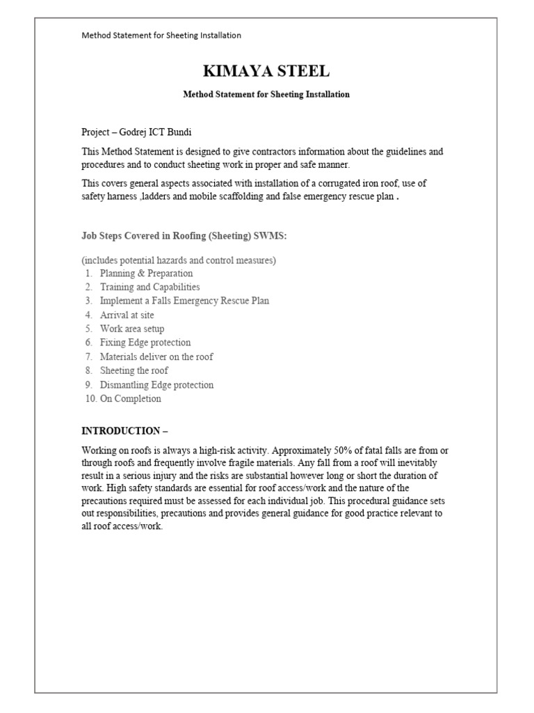 Method Statement for Sheeting Installation