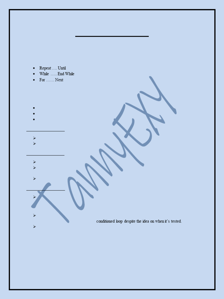 Count controlled loop Pre-Condition(-Tested) Post-conditioned loop
