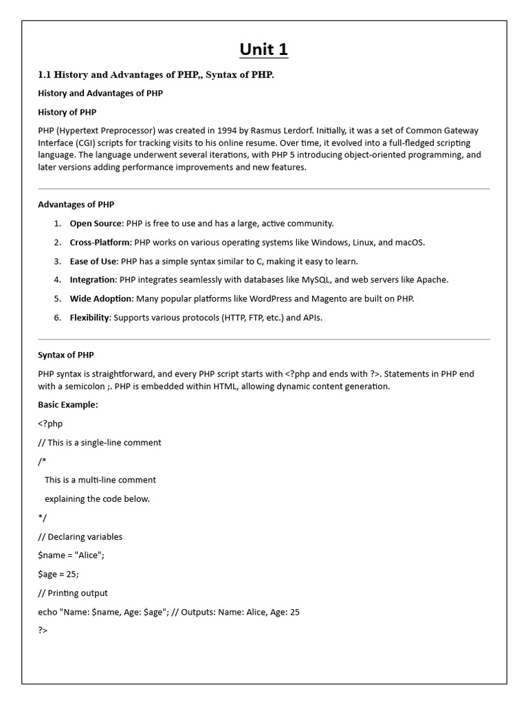 1.1 History and Advantages of PHP,, Syntax of PHP.