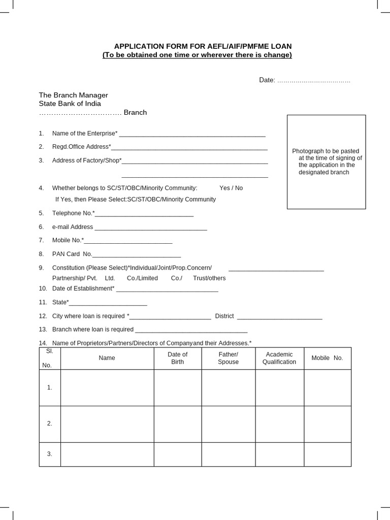 APPLICATION FORM FOR AEFL/AIF/PMFME LOAN