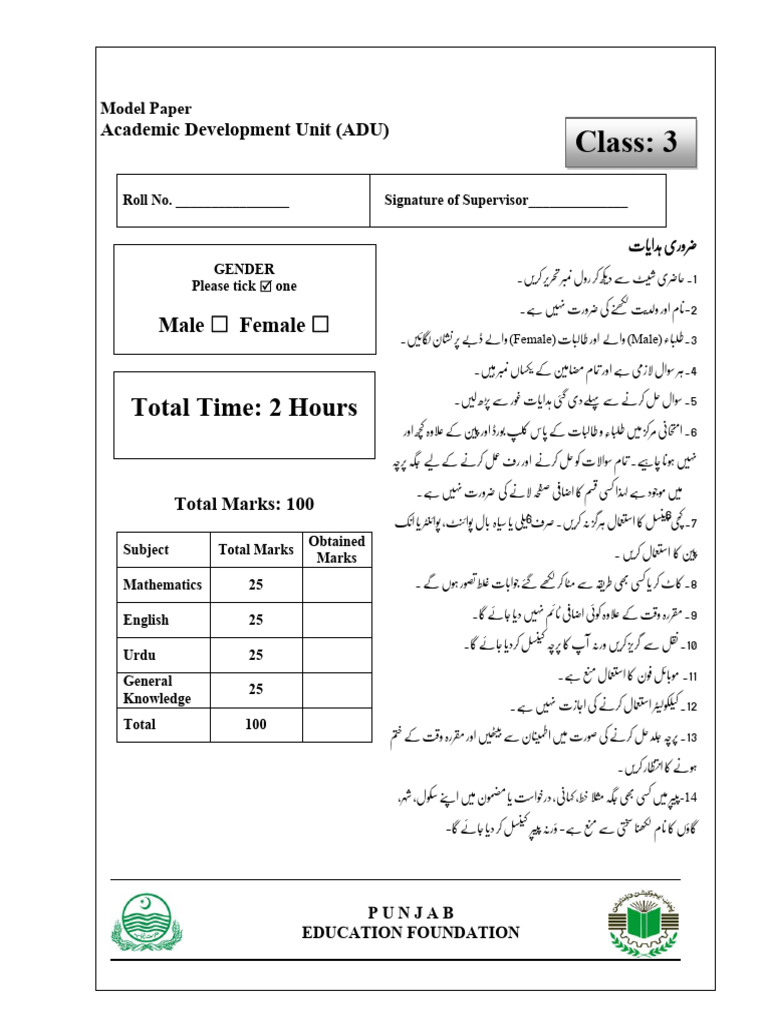 Model Paper Punjab Education Foundation – Academic Development Unit (PEF-ADU-QAT)
