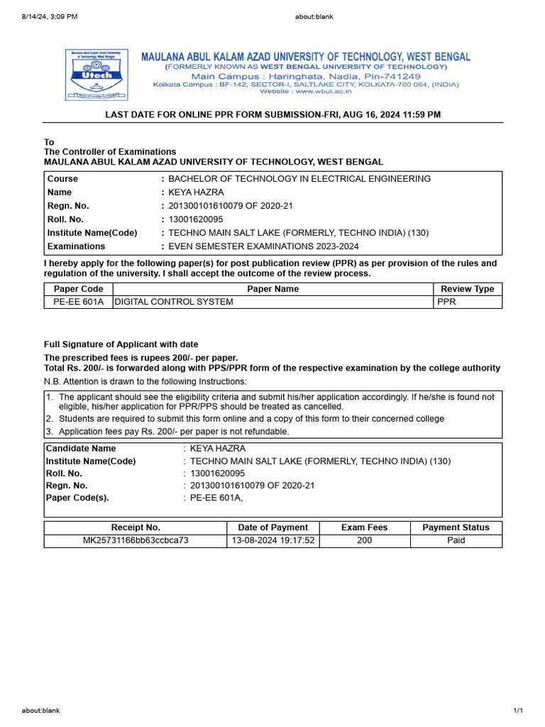 Receipt No. Date of Payment Exam Fees Payment Status