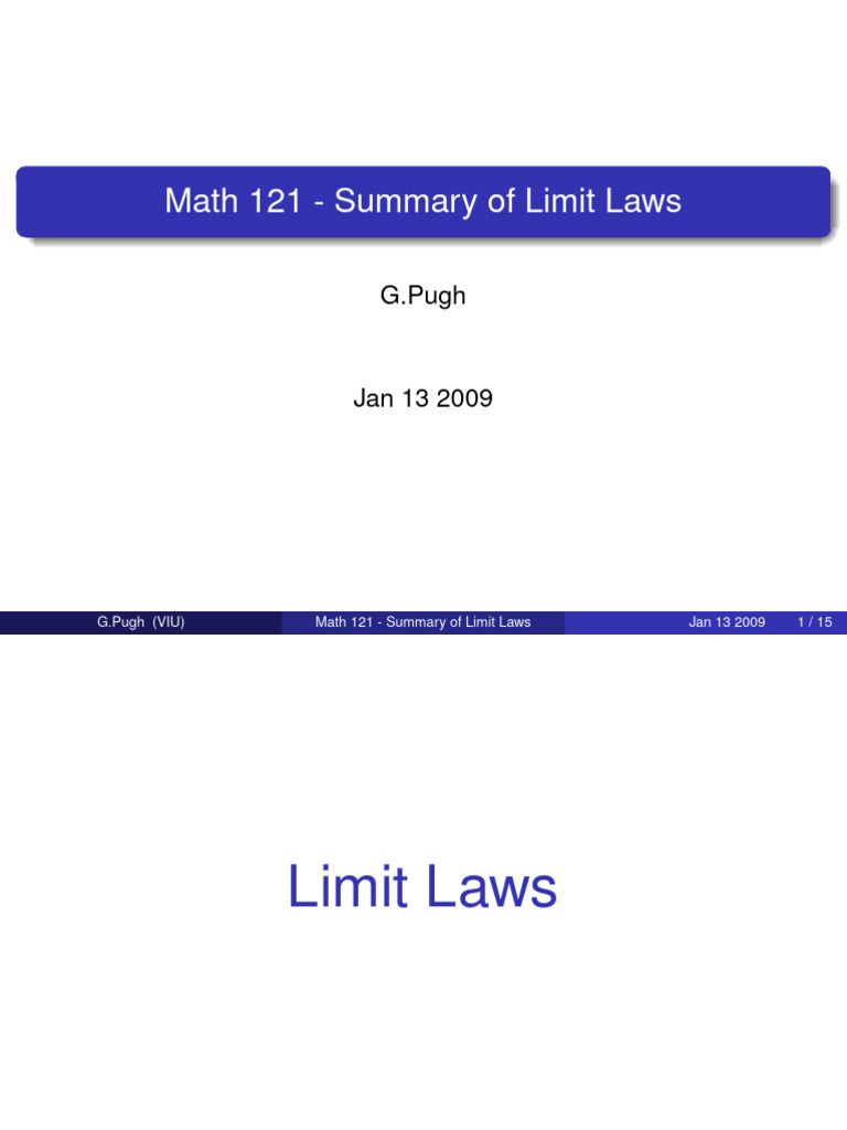 G.Pugh (VIU) Math 121 - Summary of Limit Laws Jan 13 2009 1 / 15