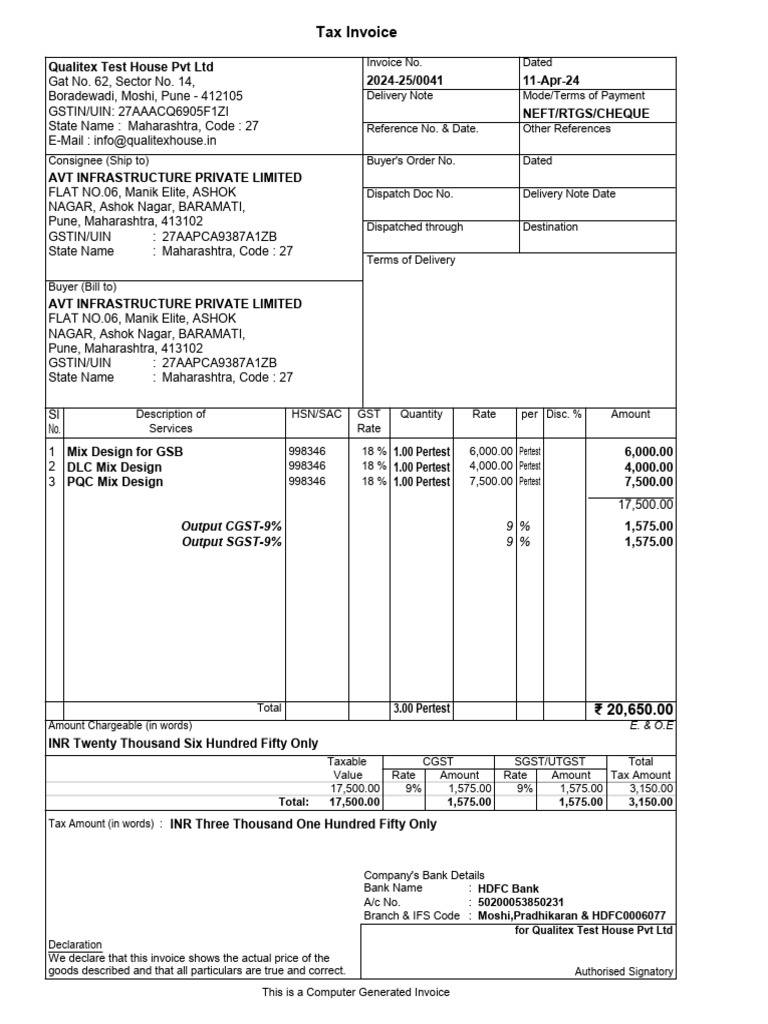 Qualitex Test House Pvt Ltd Invoice No. Dated