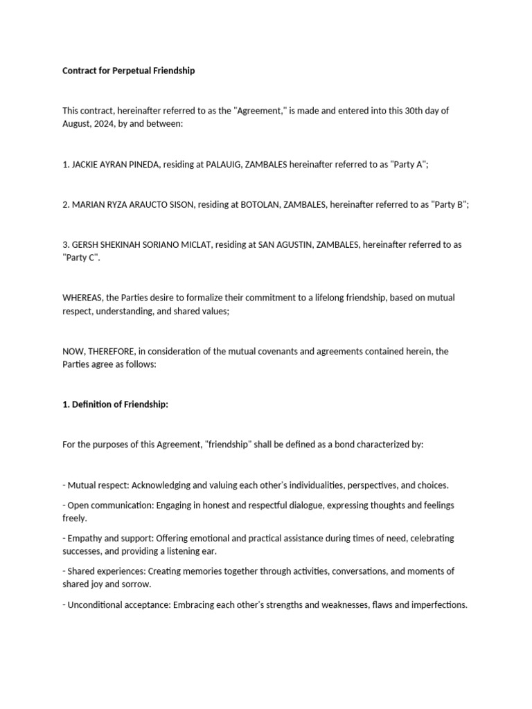 1. JACKIE AYRAN PINEDA, residing at PALAUIG, ZAMBALES hereinafter referred to as "Party A";
