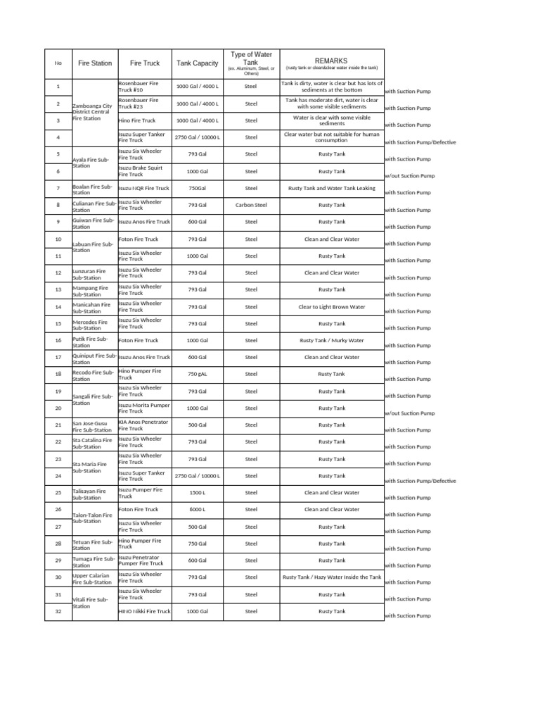 No Fire Station Fire Truck Tank Capacity Tank REMARKS