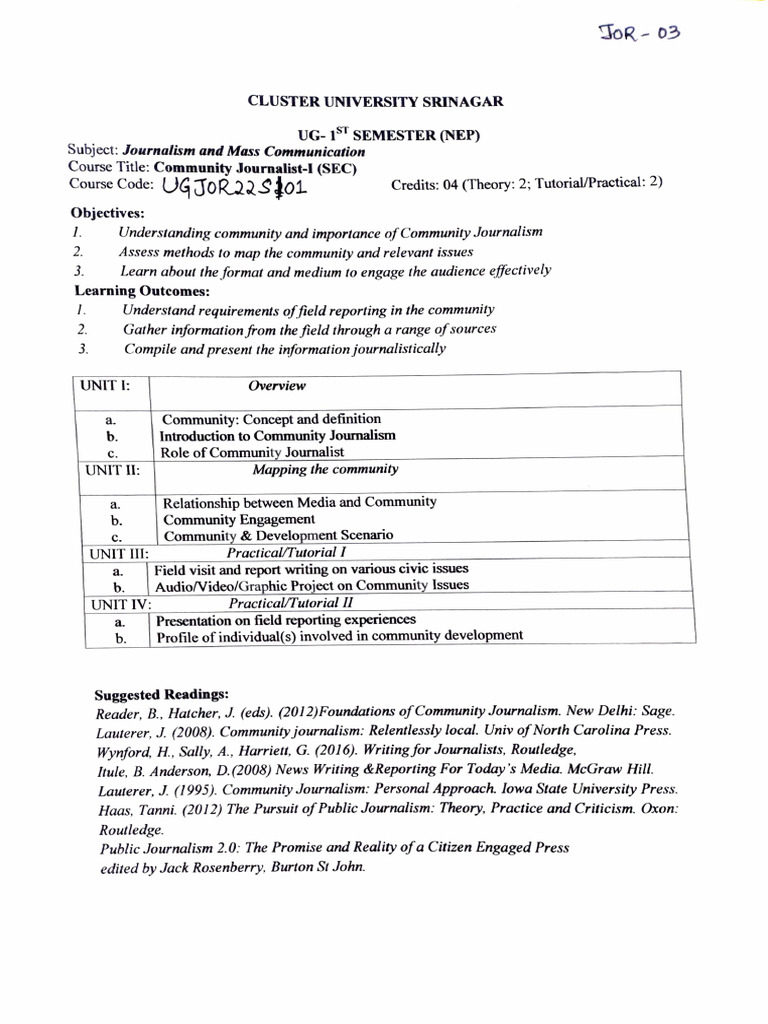 Course Code: UGJOR2So1 Credits: 04 (Theory: 2; Tutorial/Practical: 2)