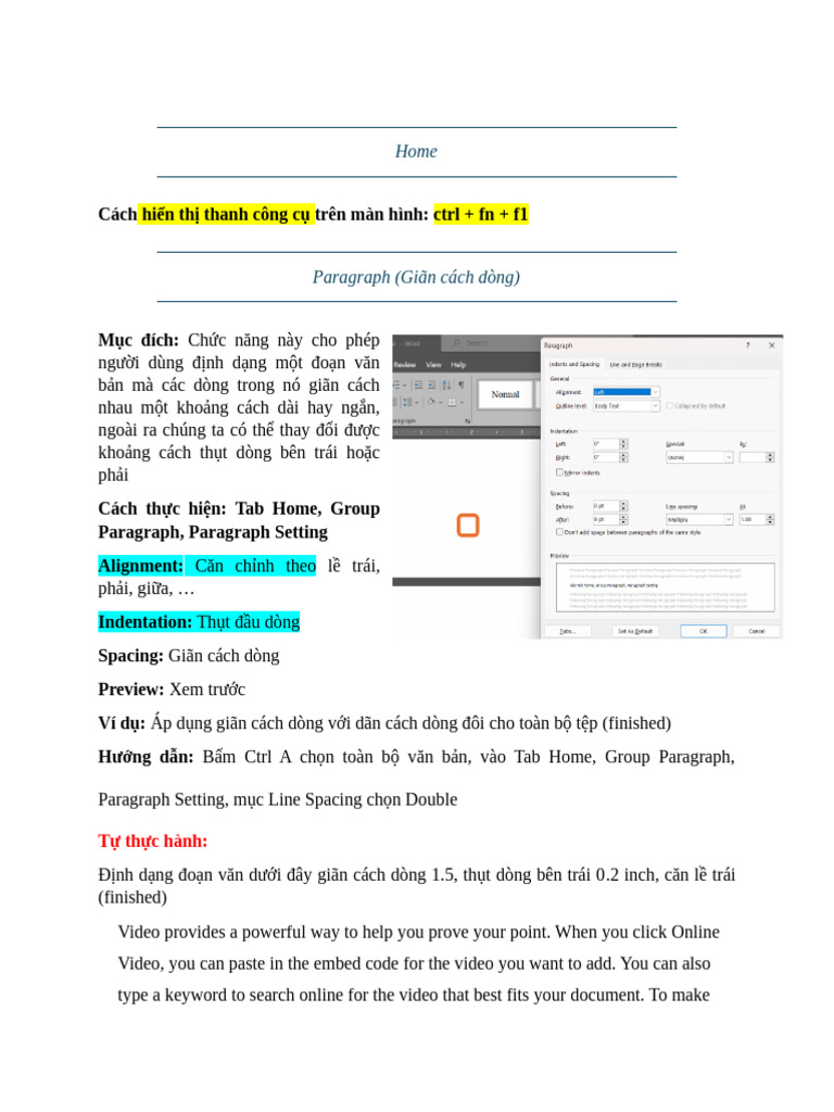 Định dạng đoạn văn dưới đây giãn cách dòng 1.5, thụt dòng bên trái 0.2 inch, căn lề trái