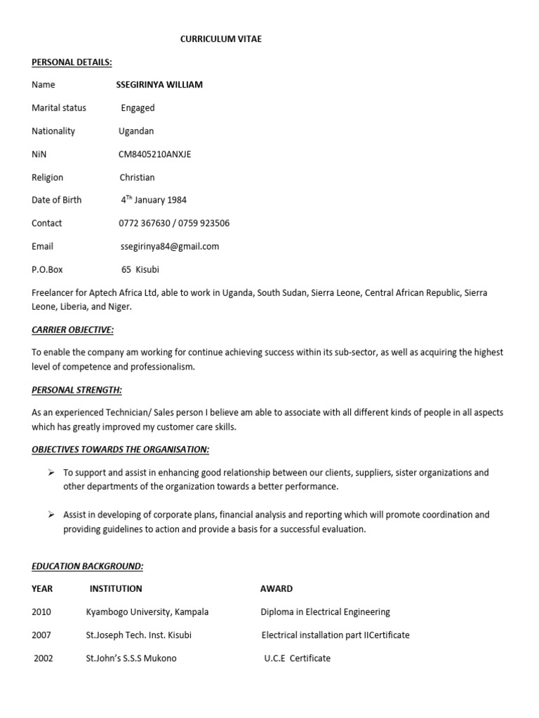 2009 worked as a technician at Solar Energy (U) Ltd Wilson Road Kampala and later posted to Mbarara as branch
