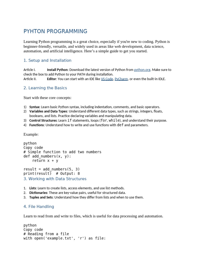 Article II. Editor: You can start with an IDE like VS Code, PyCharm, or even the built-in IDLE.