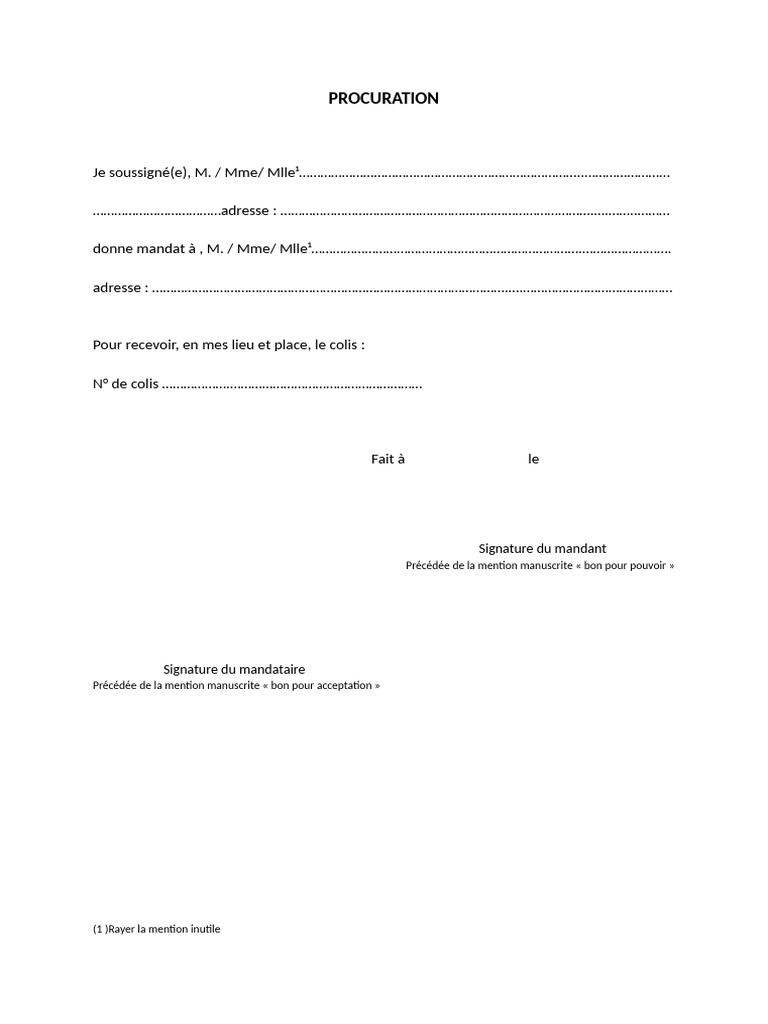 donne mandat à , M. / Mme/ Mlle¹………………………………………………………………….…………………….