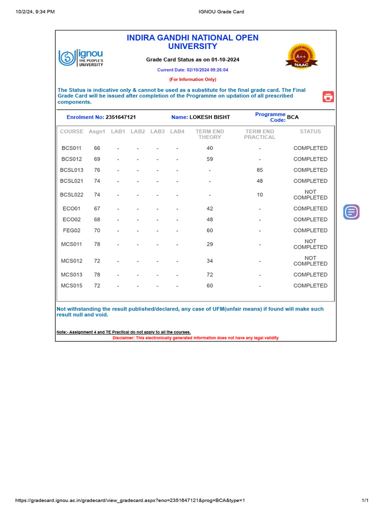 10/2/24, 9:34 PM IGNOU Grade Card