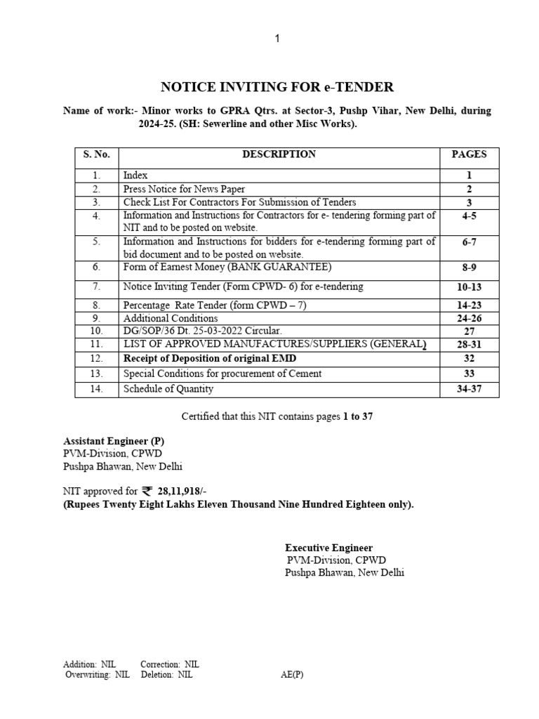 1. Name of work:- Minor works to GPRA Qtrs. at Sector-3, Pushp Vihar, New Delhi, during 2024-