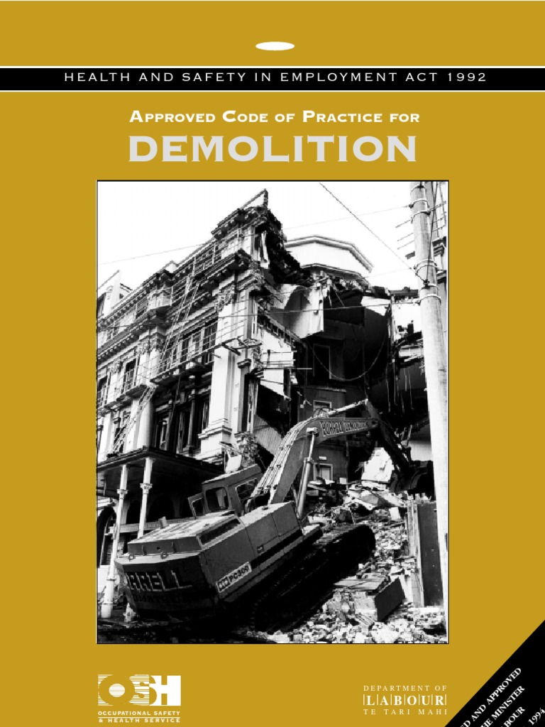I have approved this statement of preferred work practices, which is an Approved Code of Practice for Demolition, under section 20 of the Health and Safety in Employment Act 1992. When a code is approved, a Court may have regard to it in relation to compliance with the relevant sections of the Health and Safety in Employment Act. This means that if an employer in an industry or using a process to which an approved code applies can show compliance with that code in all matters it covers, a Court may consider this to be compliance with the provisions of the Act to which the code relates.