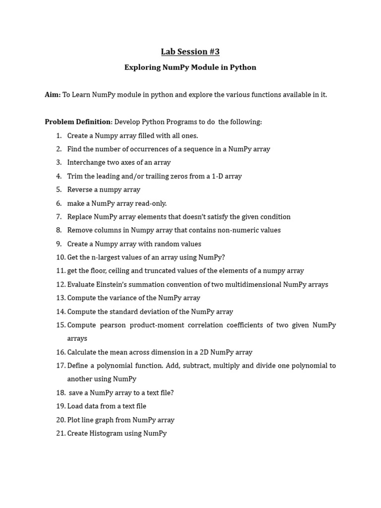 Aim: To Learn NumPy module in python and explore the various functions available in it.