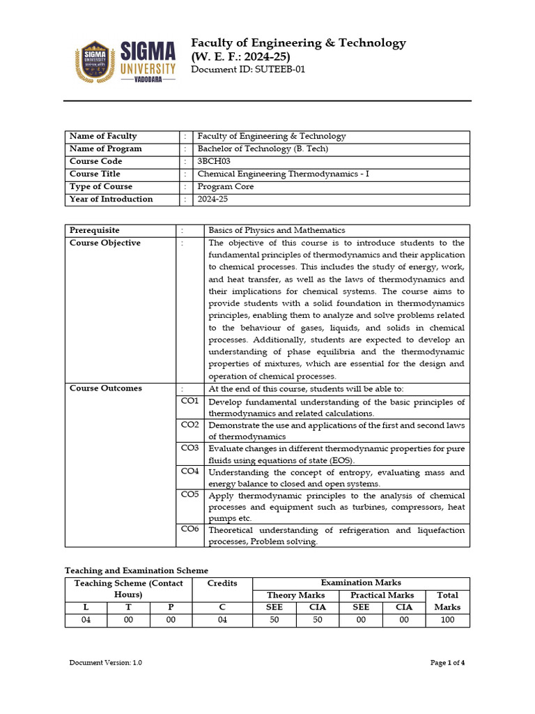 Course Title : Chemical Engineering Thermodynamics - I