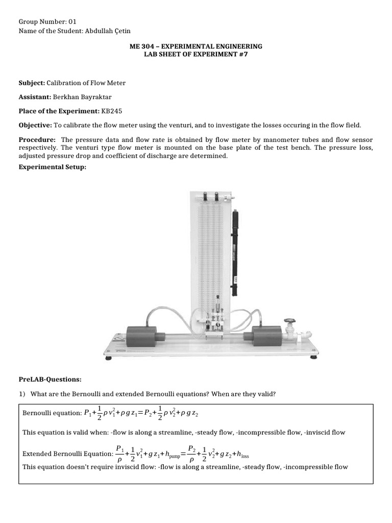 Objective: To calibrate the flow meter using the venturi, and to investigate the losses occuring in the flow field.