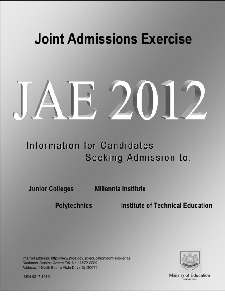 This information booklet is for students seeking admission to Junior Colleges, Millennia Institute, Polytechnics and Institute of Technical Education in 2012. This information is also available on the JAE website at www.moe.gov.sg/education/admissions/jae.