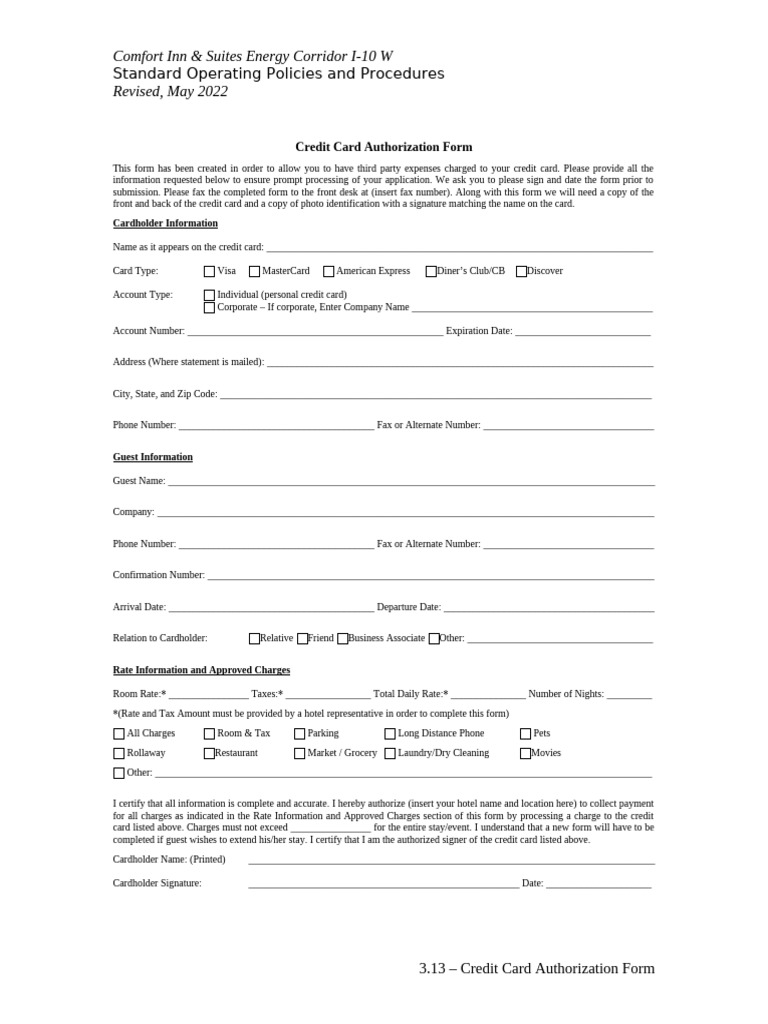 card listed above. Charges must not exceed ________________ for the entire stay/event. I understand that a new form will have to be
