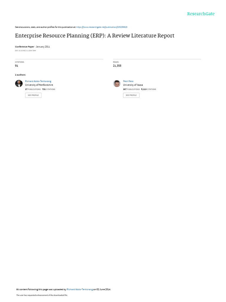 internet search, reference checking, most cited authors using Harzing’s software statistical results for mostly cited authors in the field of ERP