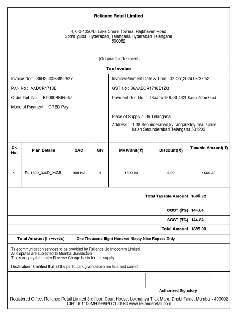 Invoice No : 36R25I0063852627 Invoice/Payment Date & Time : 02 Oct,2024 08:37:52