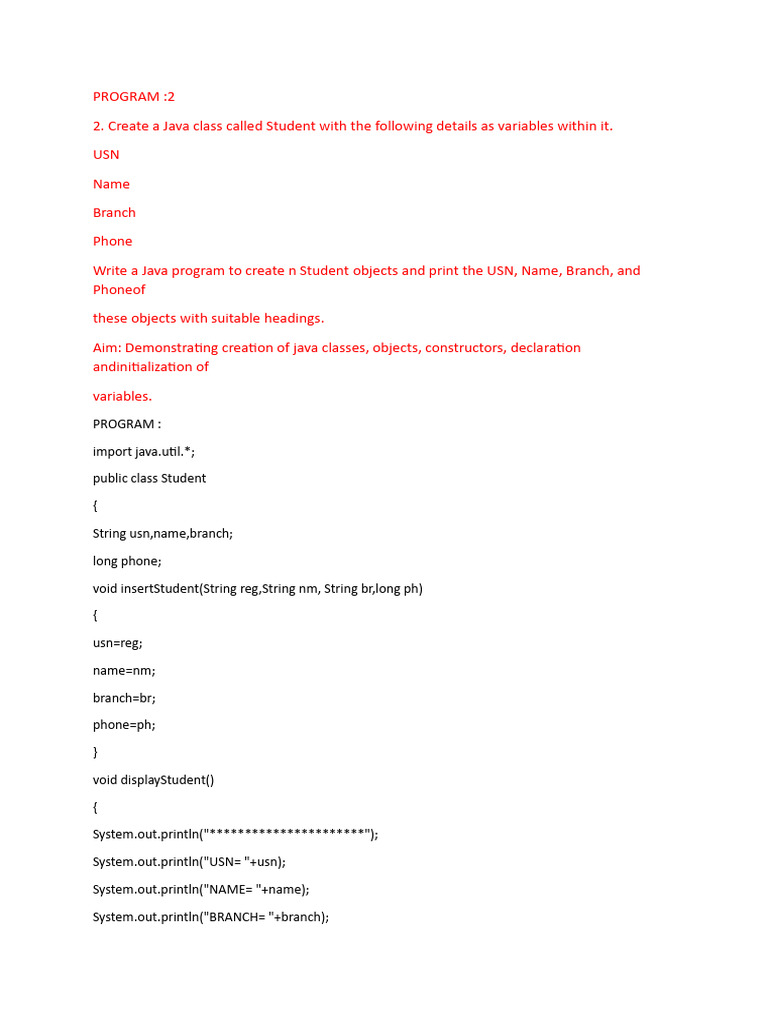 Write a Java program to create n Student objects and print the USN, Name, Branch, and