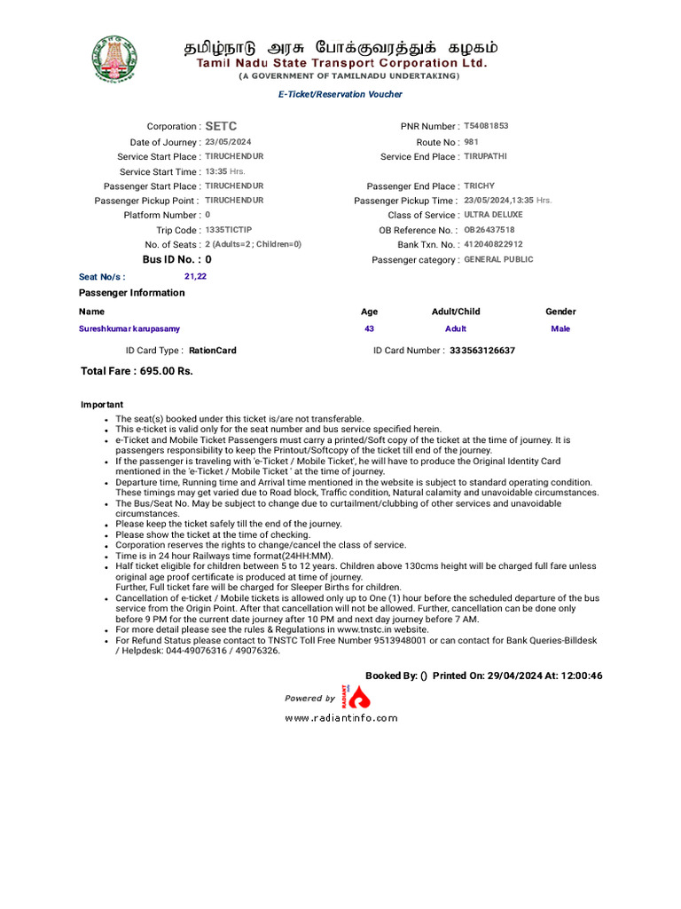 No. of Seats : 2 (Adults=2 ; Children=0) Bank Txn. No. : 412040822912