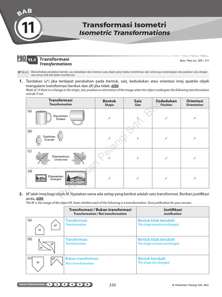 SP 11.1.1 Memerihalkan perubahan bentuk, saiz, kedudukan dan orientasi suatu objek yang melalui transformasi, dan seterusnya menerangkan idea padanan satu-dengan-