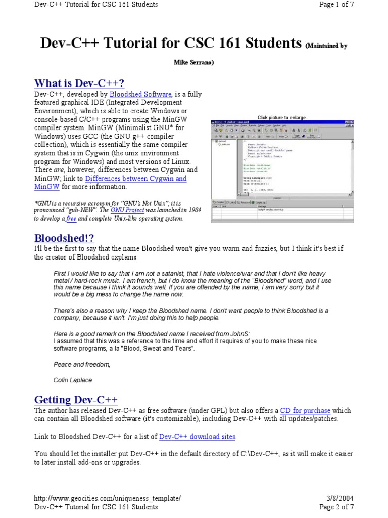 Dev-C++, developed by Bloodshed Software, is a fully featured graphical IDE (Integrated Development Environment), which is able to create Windows or console-based C/C++ programs using the MinGW compiler system. MinGW (Minimalist GNU* for Windows) uses GCC (the GNU g++ compiler collection), which is essentially the same compiler system that is in Cygwin (the unix environment program for Windows) and most versions of Linux. There are, however, differences between Cygwin and MinGW; link to Differences between Cygwin and MinGW for more information.