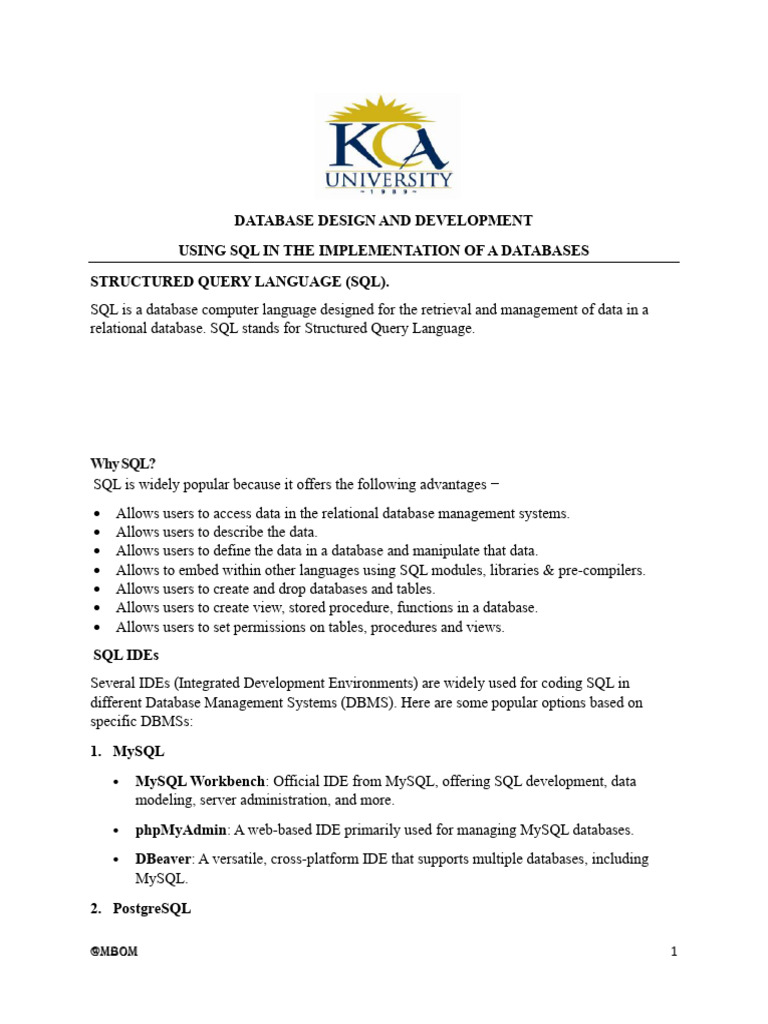 Management Systems (RDMS) like MySQL, MS Access, Oracle, Sybase, Informix, Postgres and