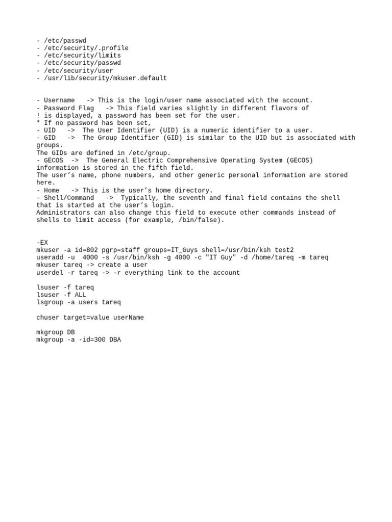 mkuser -a id=802 pgrp=staff groups=IT_Guys shell=/usr/bin/ksh test2