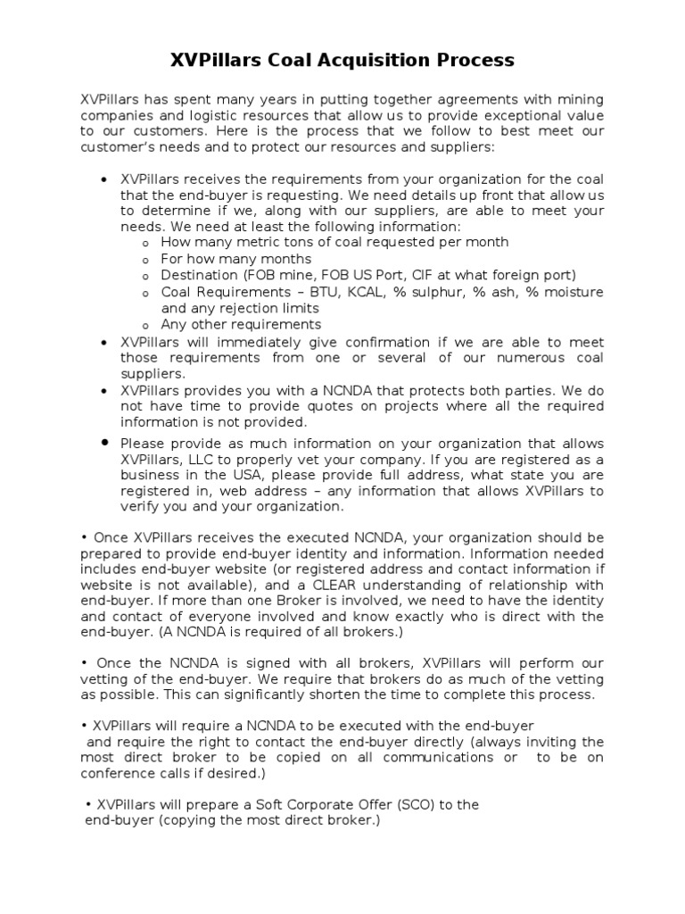 XVPillars has spent many years in putting together agreements with mining companies and logistic resources that allow us to provide exceptional value to our customers. Here is the process that we follow to best meet our customers needs and to protect our resources and suppliers: XVPillars receives the requirements from your organization for the coal that the end-buyer is requesting. We need details up front that allow us to determine if we, along with our suppliers, are able to meet your needs. We need at least the following information: o How many metric tons of coal requested per month o For how many months o Destination (FOB mine, FOB US Port, CIF at what foreign port) o Coal Requirements BTU, KCAL, % sulphur, % ash, % moisture and any rejection limits o Any other requirements XVPillars will immediately give confirmation if we are able to meet those requirements from one or several of our numerous coal suppliers. XVPillars provides you with a NCNDA that protects both parties. We do not have time to provide quotes on projects where all the required information is not provided. Please provide as much information on your organization that allows XVPillars, LLC to properly vet your company. If you are registered as a business in the USA, please provide full address, what state you are registered in, web address any information that allows XVPillars to verify you and your organization.