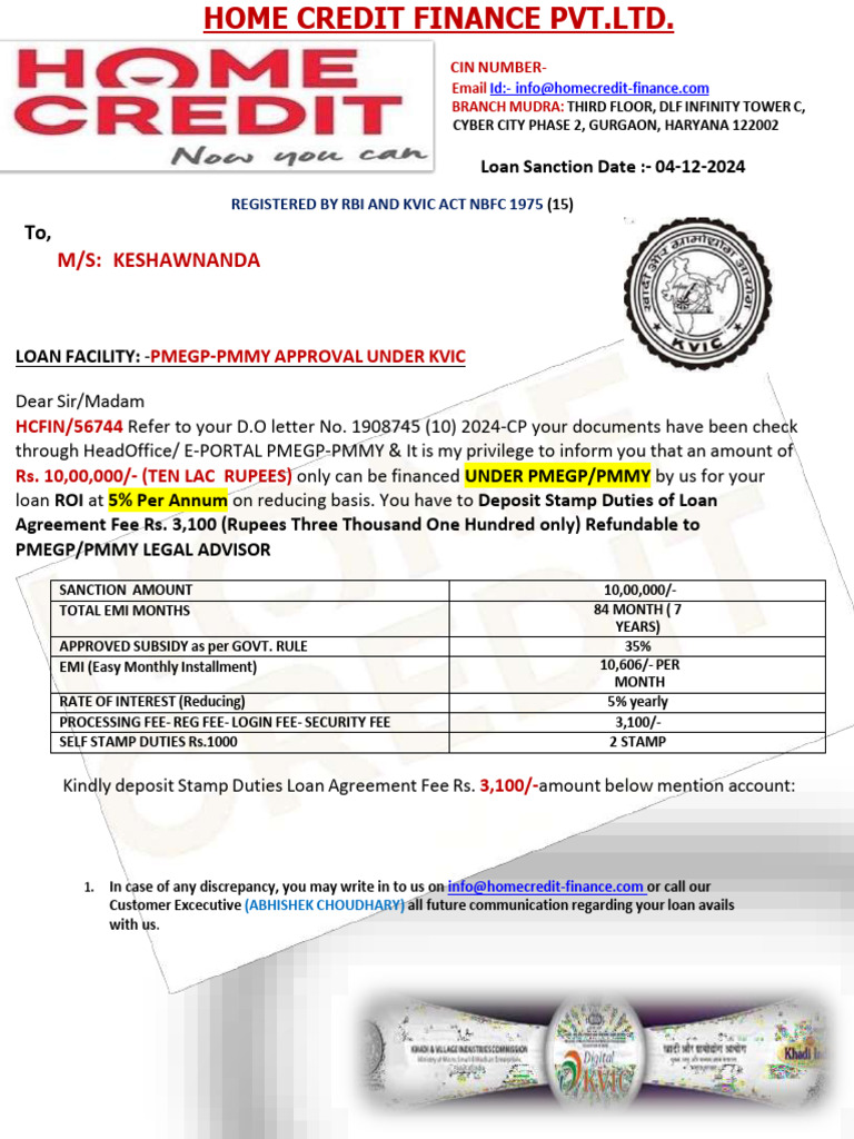 (Thank you for choosing Home Credit Finance Under KVIC. and assuring you of our best Services atall time, looking