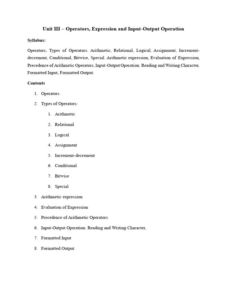 Precedence of Arithmetic Operators, Input-Output Operation: Reading and Writing Character,