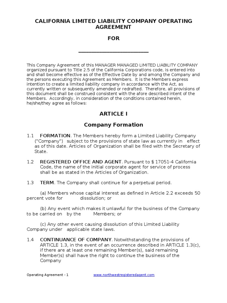 1.1 FORMATION. The Members hereby form a Limited Liability Company ("Company") subject to the provisions of state law as currently in effect as of this date. Articles of Organization shall be filed with the Secretary of State. REGISTERED OFFICE AND AGENT. Pursuant to 17051-4 California Code, the name of the initial corporate agent for service of process shall be as stated in the Articles of Organization. TERM. The Company shall continue for a perpetual period.