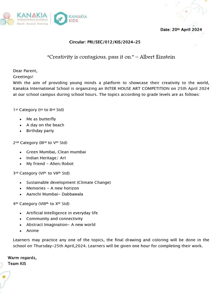 Kanakia International School is organizing an INTER HOUSE ART COMPETITION on 25th April 2024