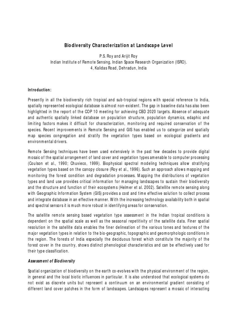 P.S. Roy and Arijit Roy Indian Institute of Remote Sensing, Indian Space Research Organization (ISRO). 4, Kalidas Road, Dehradun, India