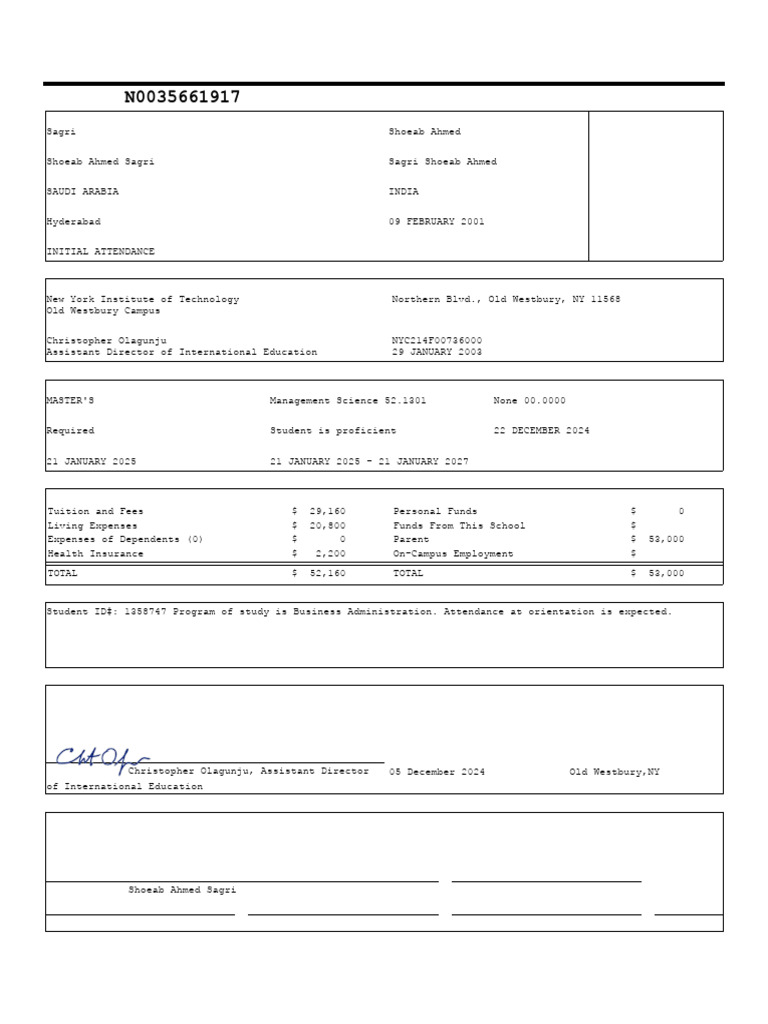 SEVIS ID: N0035661917 (F-1) NAME: Shoeab Ahmed Sagri