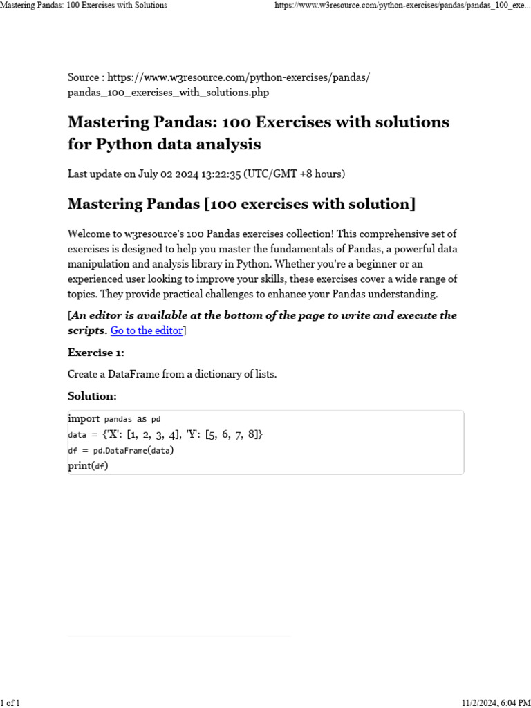 Mastering Pandas: 100 Exercises with Solutions https://www.w3resource.com/python-exercises/pandas/pandas_100_exe...