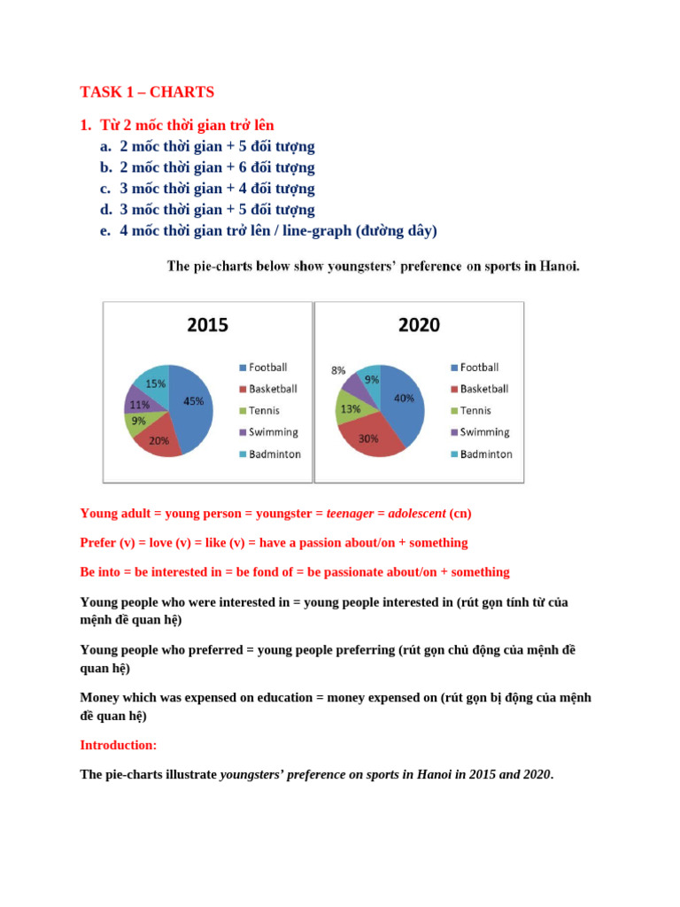 The pie-charts illustrate youngsters’ preference on sports in Hanoi in 2015 and 2020.
