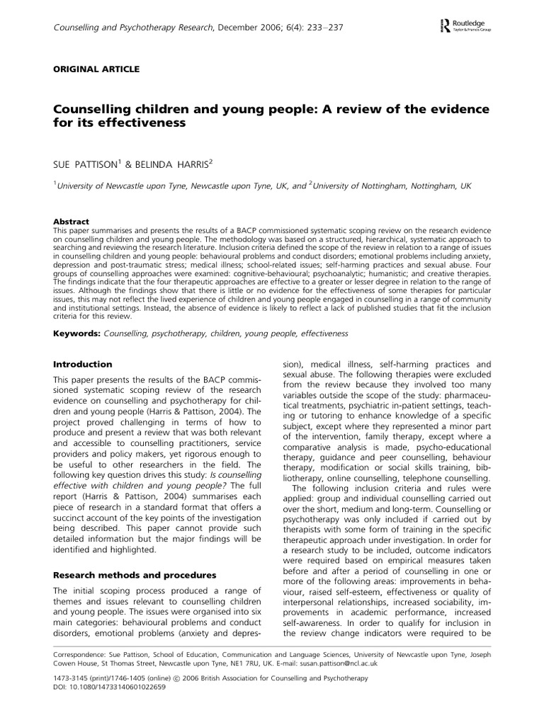 counselling issues. High quality controlled trials not duct problems (Weisz et al., 1987). One randomised
