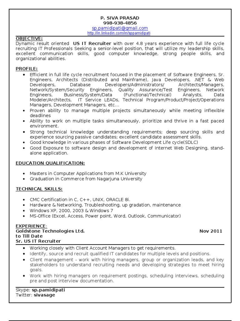 OBJECTIVE: Dynamic result oriented US IT Recruiter with over 4.8 years experience with full life cycle recruiting IT Professionals Seeking a senior-level position, that will utilize my leadership skills, excellent communication skills, good computer knowledge, strong people skills, and organizational abilities. PROFILE: Efficient in full life cycle recruitment focused in the placement of Software Engineers, Sr. Engineers, Architects (Distributed and Mainframe), Java Developers, .NET & Web Developers, Database Developers/Administrators/ Architects/Managers, Network/System/Security Engineers, Quality Assurance/Test Engineers, Network Engineers, Business/System/Data (Functional/Technical) Analysts, Data Modeler/Architects, IT Service LEADs, Technical Program/Product/Project/Operations Managers, Development Managers, etc Proven ability to manage multiple projects simultaneously while meeting inflexible deadlines Ability to work on multiple tasks simultaneously, prioritize and thrive in a fast paced environment. Strong technical knowledge understanding requirements; deep sourcing skills and experience sourcing passive candidates; excellent candidate assessment skills. Good knowledge in various phases of Software Development Life cycle(SDLC) Good Exposure to software design and development of Internet Web Designing, standalone application. EDUCATION QUALIFICATION: Masters in Computer Applications from M.K University Graduation in Commerce from Nagarjuna University