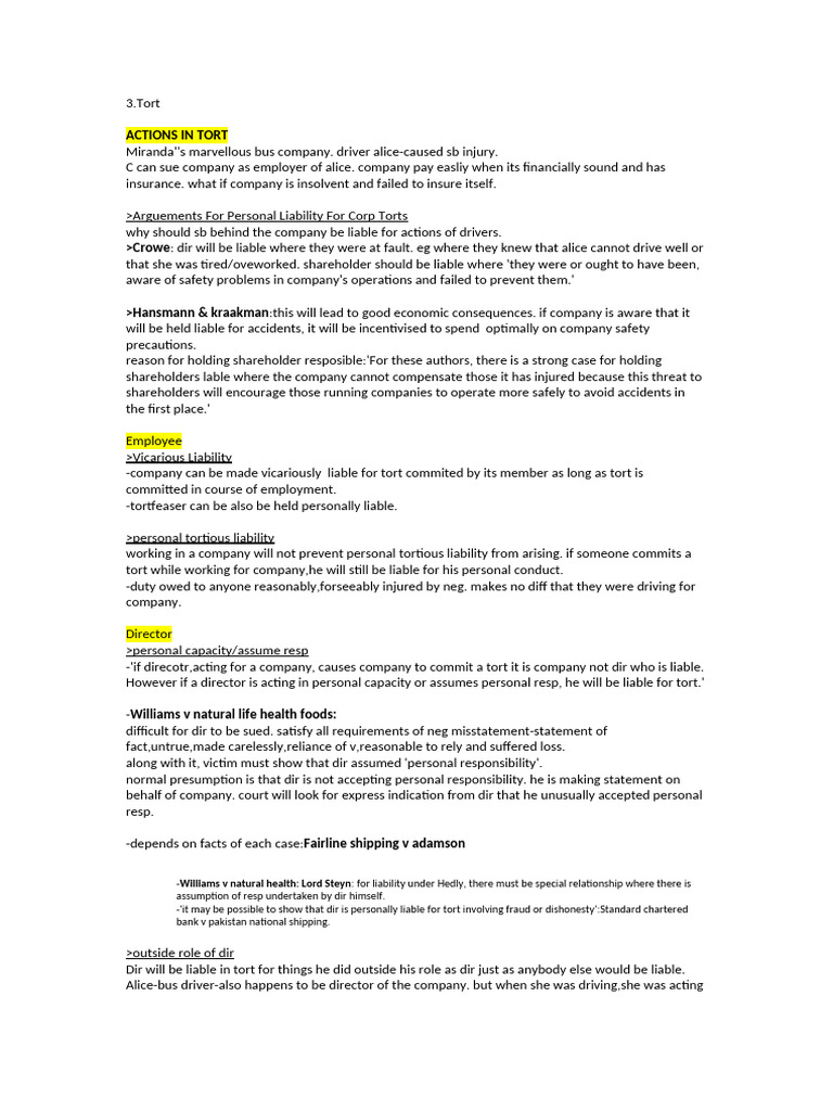 However if a director is acting in personal capacity or assumes personal resp, he will be liable for tort.'