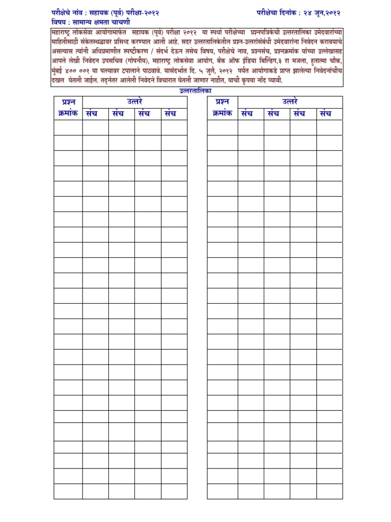 महारा टर् लोकसेवा आयोगामाफर्त “सहायक (पूवर्) परीक्षा 2012” या पधार् परीक्षे च्या नपितर्केची उत्तरतािलका उमेदवारांच्या